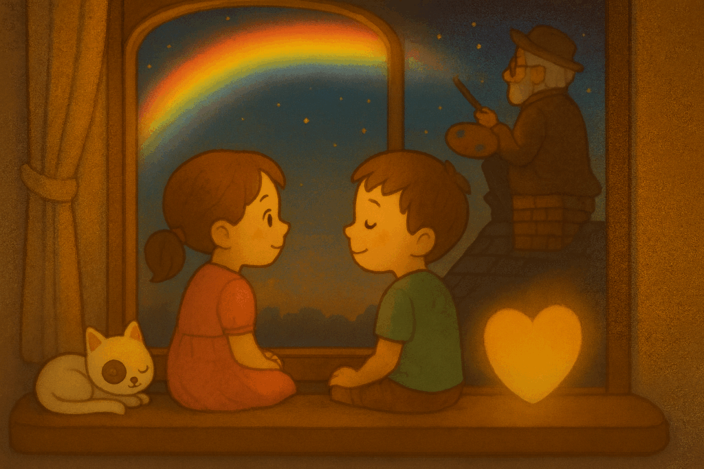 Děti i pan Duhař se na minutku zastavili, jako by se celý svět na okamžik opřel o zábradlí a díval se do ticha. Pak se zhluboka nadechli – pekařskou vůni chleba až do bříška – a potichu řekli: „Děkujeme, červená, že držíš naše srdce statečné.“